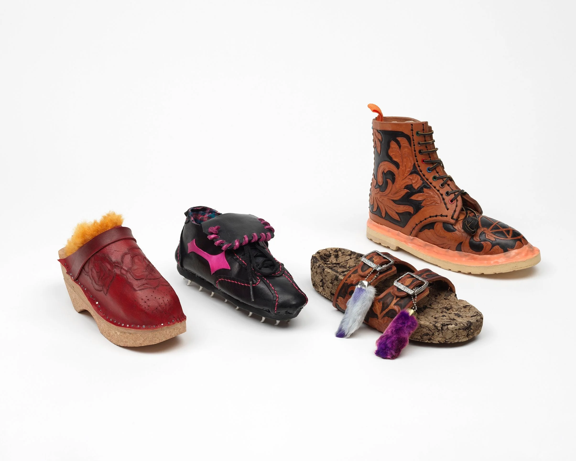 Tooled Leather, cork, buckles, paint, rabbits' feet